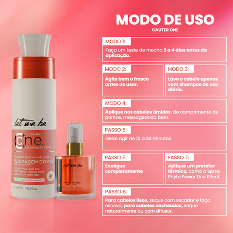 A Cauter One atua no córtex capilar, reparando danos, fortalecendo a fibra e alinhando cutículas fragilizadas, enquanto o Velvet Drops sela os fios, proporcionando brilho radiante, maciez e toque aveludado.